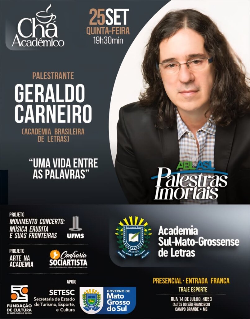 Nesta quinta-feira, 25 de setembro, a Academia Sul-Mato-Grossense de Letras recebe o poeta, letrista, dramaturgo e tradutor Geraldo Eduardo Carneiro, membro da Academia Brasileira de Letras, para uma noite de reflexão e literatura no tradicional Chá Acadêmico. A palestra, intitulada “Uma vida entre as palavras”, propõe um mergulho na trajetória multifacetada do autor, cuja escrita transita entre o erudito e o coloquial, o clássico e o contemporâneo — sempre permeada por poesia, ironia e beleza.