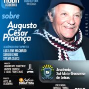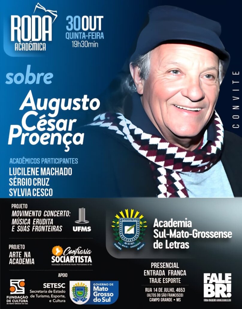 A Academia Sul-Mato-Grossense de Letras realiza nesta quinta-feira, 30 de outubro, às 19h30, mais uma edição da Roda Acadêmica, com homenagem ao saudoso escritor Augusto César Proença. O evento será realizado presencialmente no auditório da ASL, localizado na Rua 14 de Julho, nº 4653, Altos do São Francisco, com entrada gratuita. O projeto é uma parceria da ASL com apoio da Setesc – Secretaria de Estado de Turismo, Esporte e Cultura – pela Fundação de Cultura de MS – FCMS.